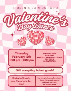 We welcome students to join us for a Valentine’s Day Dance on Thursday, February 12th from 1:00 pm – 2:00 pm in the Gym. Students will enjoy the following: